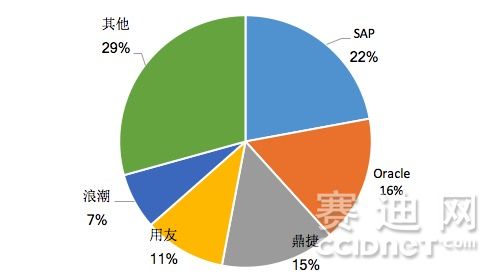 回顾2017年,国内外智能制造产业ERP软件厂商市场集中度进一步提高,其中SAP、ORACLE、鼎捷、用友、浪潮排名前五,其市场占有率分别为22.1%、16.2%、14.7%、10.5%和7.2%,占领整个制造产业ERP市场近70%的份额。